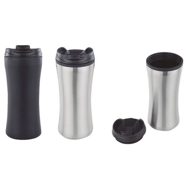 Termo ergonomico doble pared de acero inoxidable interior de plastico y tapa enroscable. Cap.450ml
