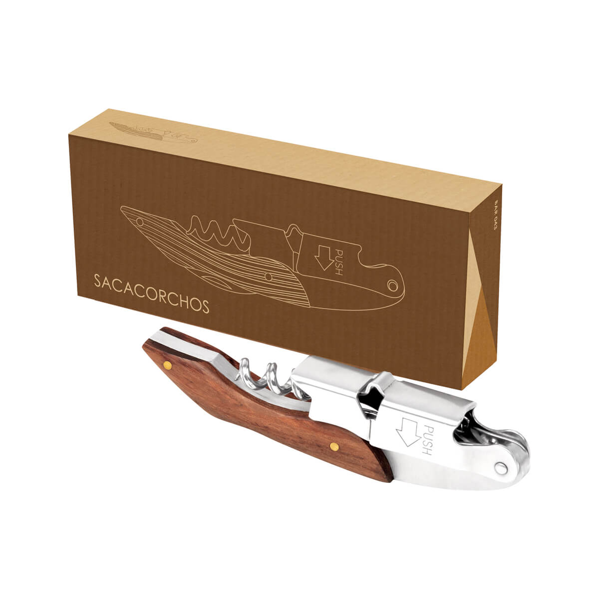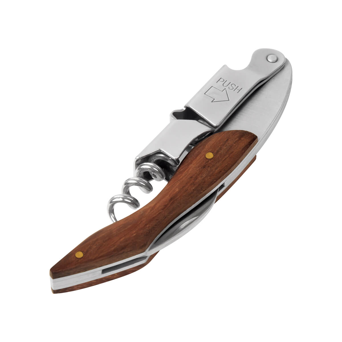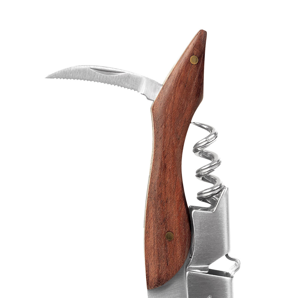 Sacacorchos de acero inoxidable. Ideal para los más aventureros. Cuenta con un mango de madera, mecanismo de doble bisagra, sacacorchos, detapador de botellas y cortador de lámina dentado. Incluye elegante funda de curpiel y caja individual.