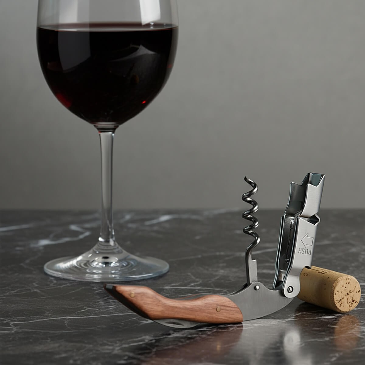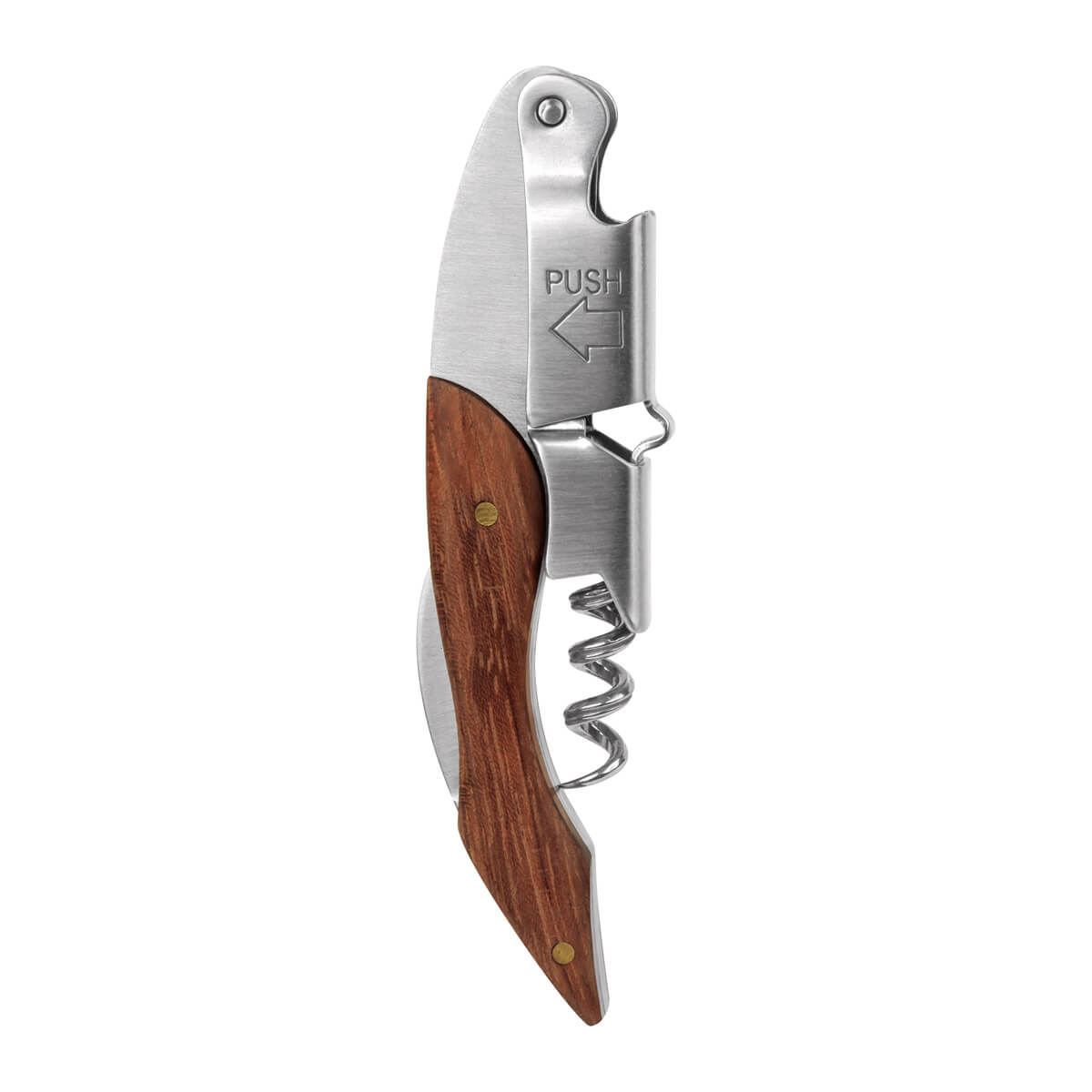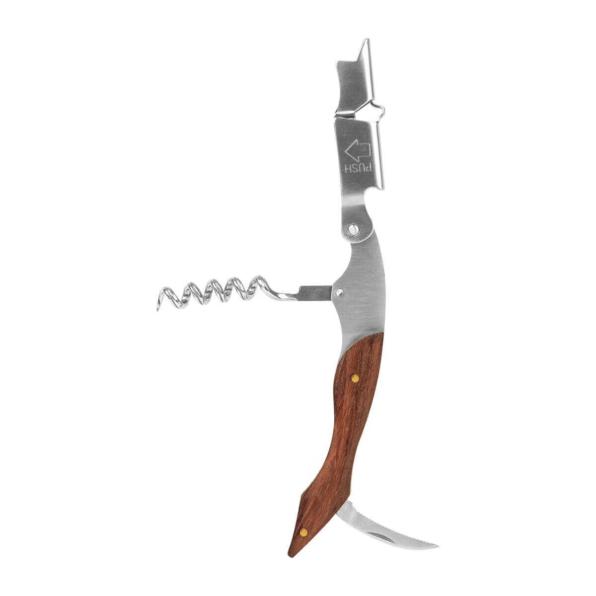 Sacacorchos de acero inoxidable. Ideal para los más aventureros. Cuenta con un mango de madera, mecanismo de doble bisagra, sacacorchos, detapador de botellas y cortador de lámina dentado. Incluye elegante funda de curpiel y caja individual.