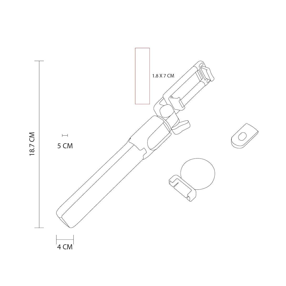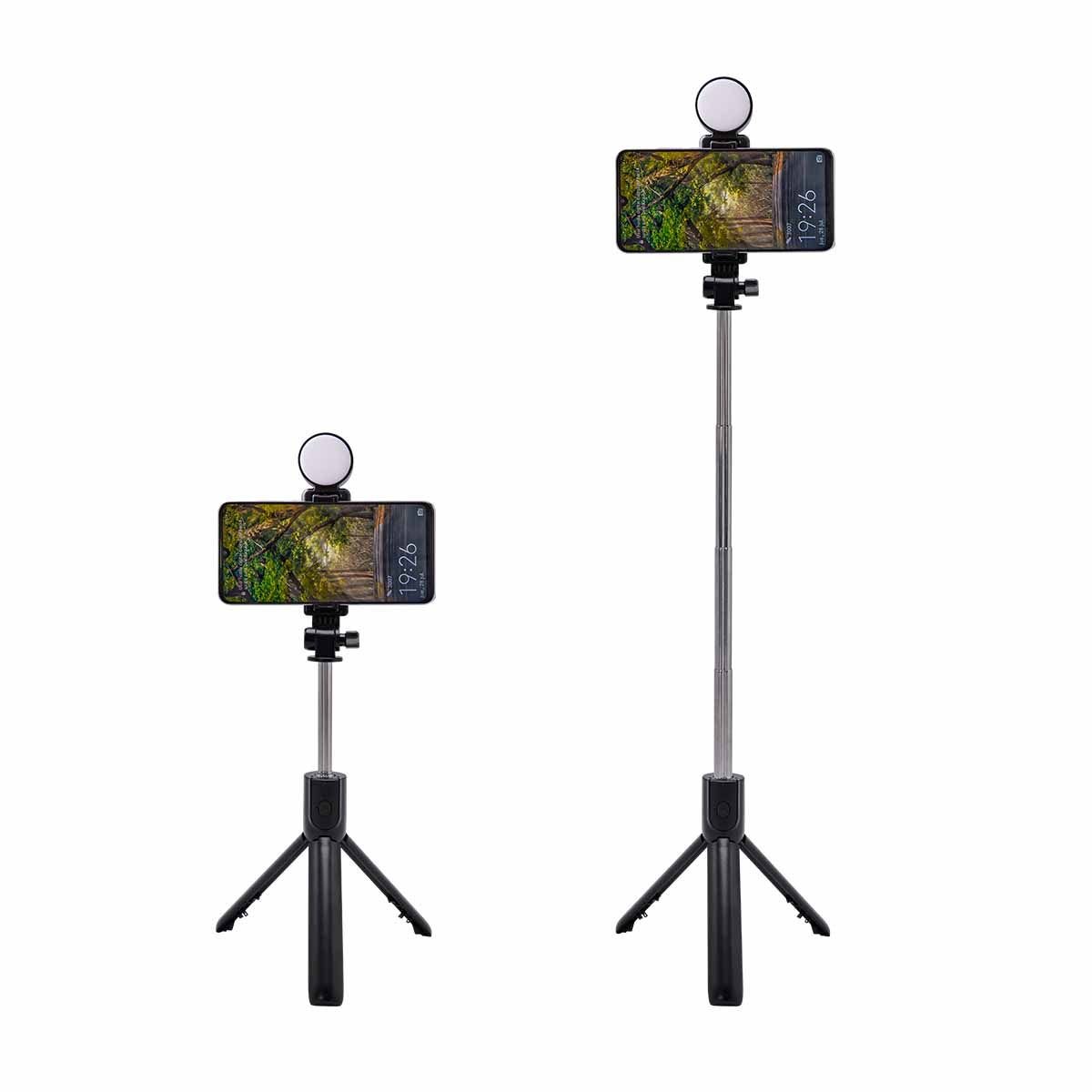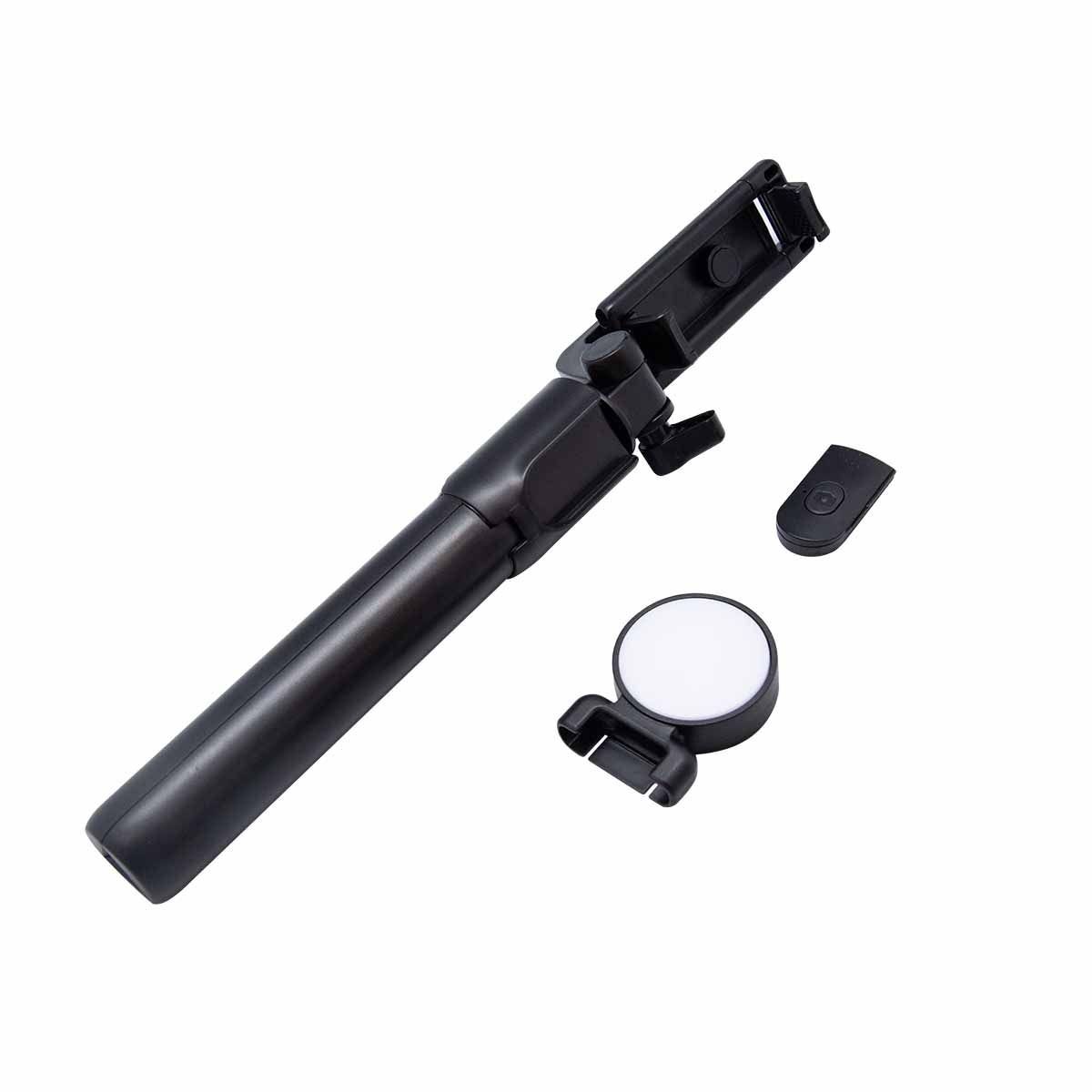 Selfie stick con tripie. Incluye control bluetooth para disparo de fotos vía remota (batería de botón incluida). Conexión de hasta 10m de distancia. Incluye led desmontable con luz fría, cálida y neutral. El holder gira 360° y el tubo retráctil alcanza hasta 68 cm. Incluye cable cargador con conexión micro USB para luz LED.