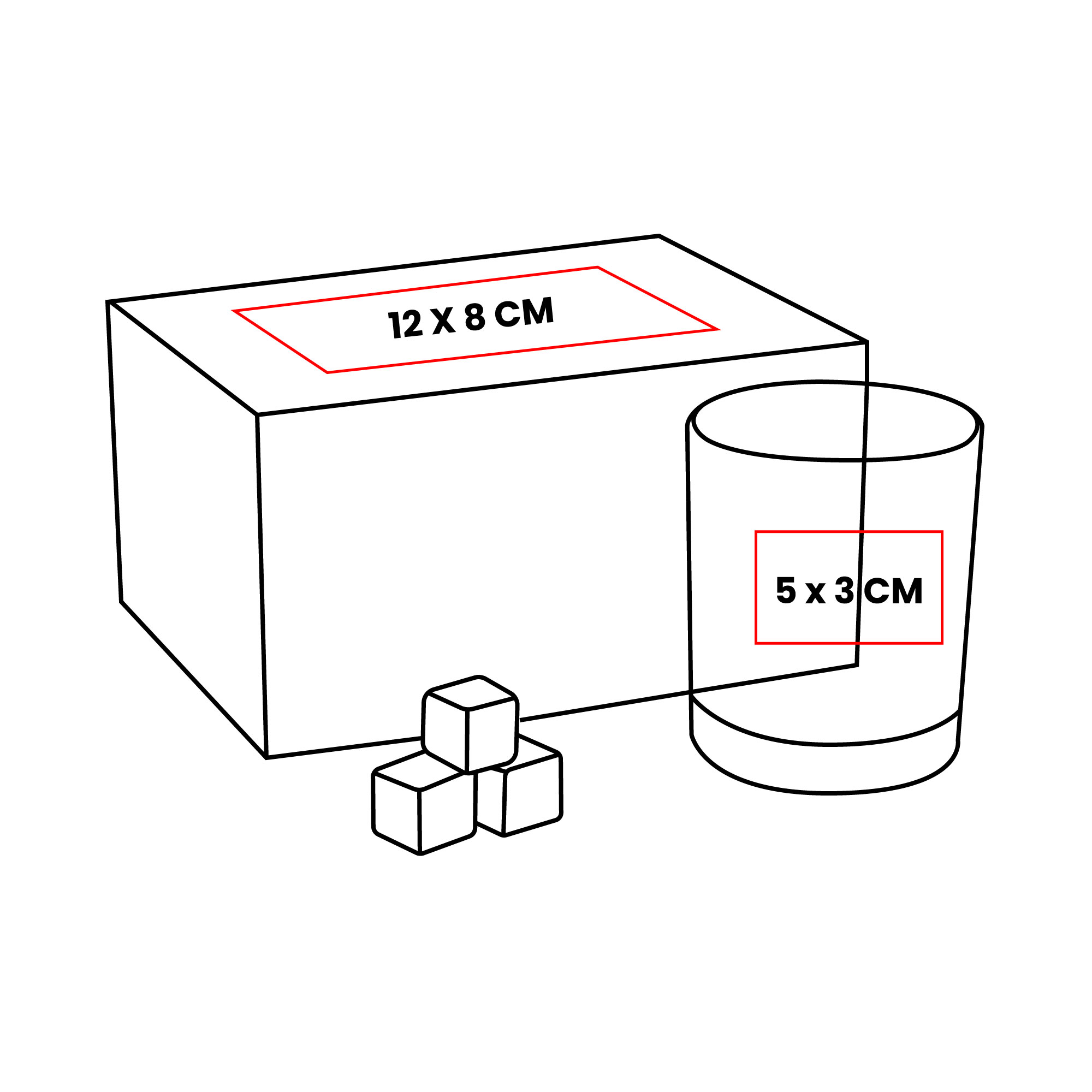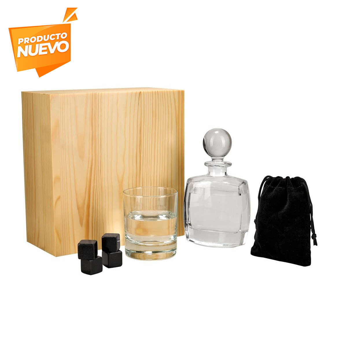 Set de bar. Incluye vaso de cristal, 3 enfriadores de piedra y estuche de madera.