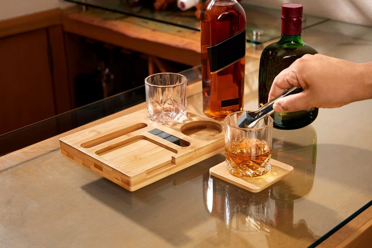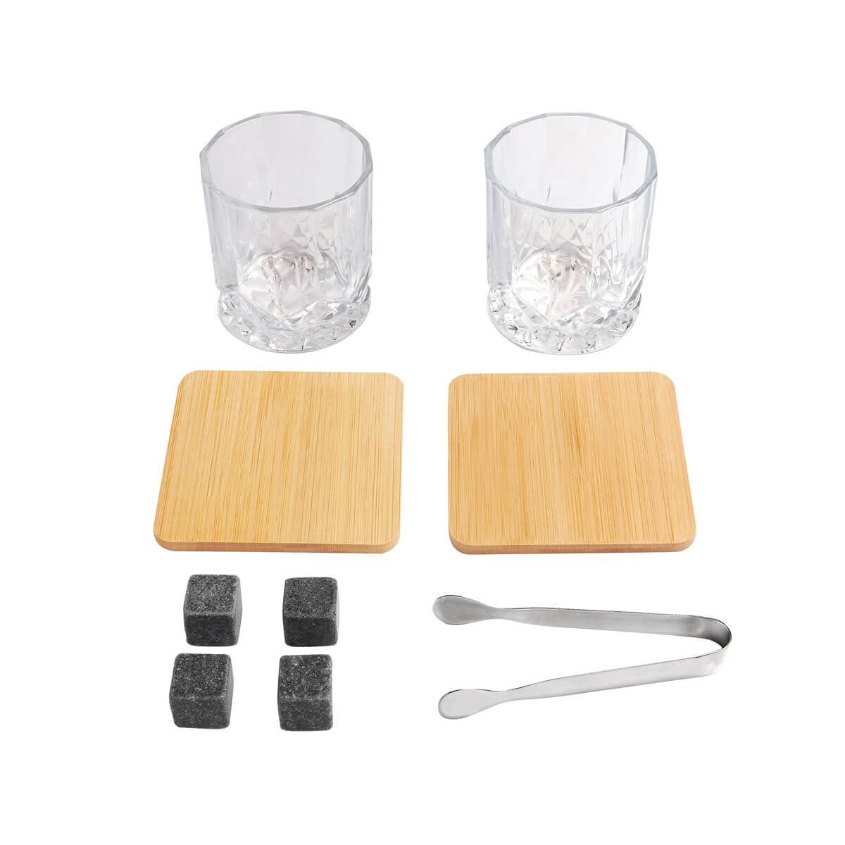 Set de bar con base de bambú. Incluye 2 vasos de cristal para whisky, 4 cubos enfriadores de granito , 2 portavasos de bambú y pinzas para hielo de acero inoxidable. Incluye caja individual.