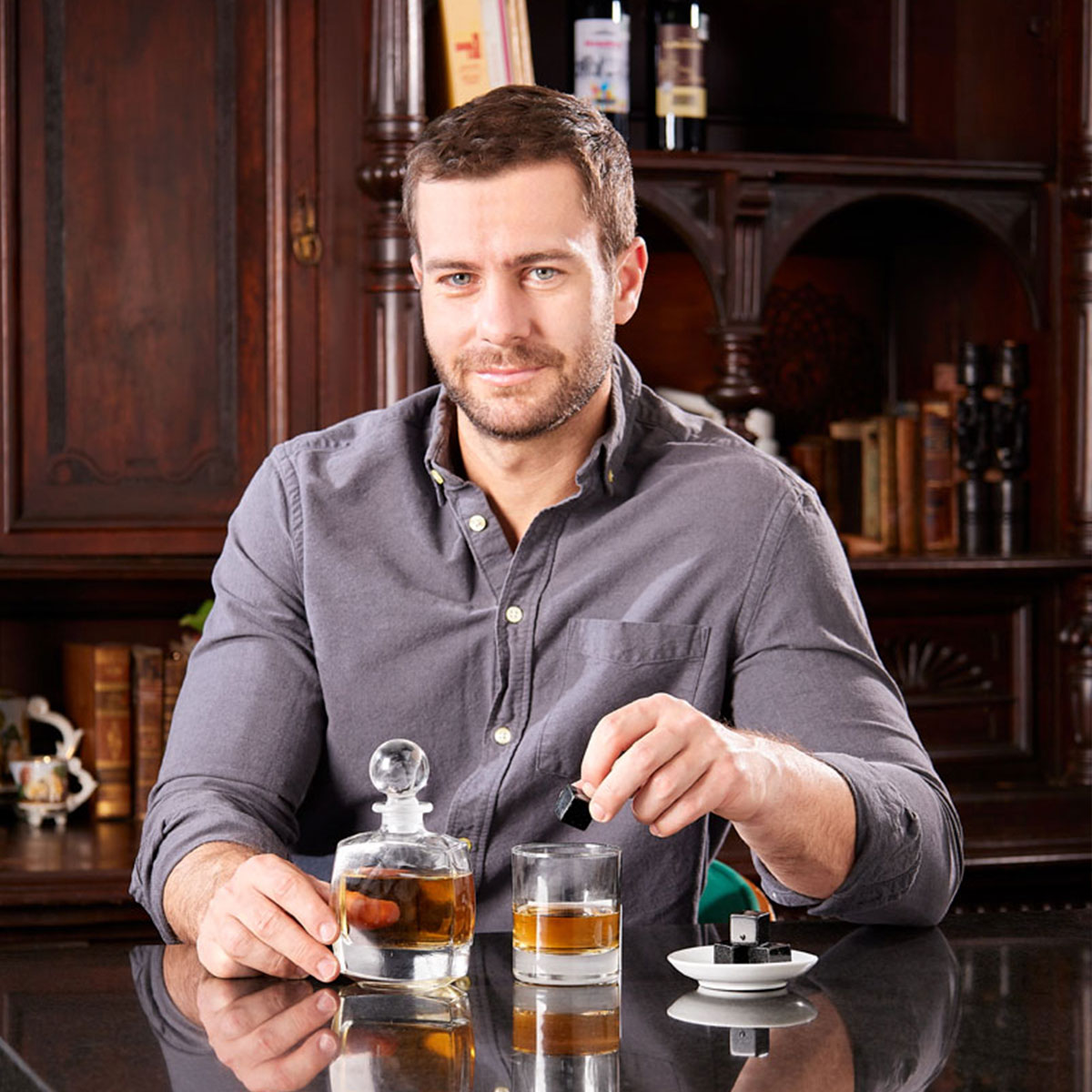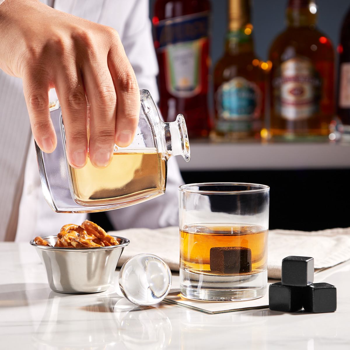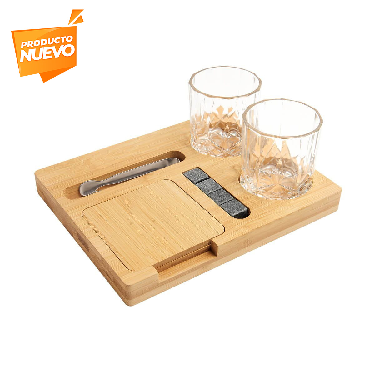Set de bar. Incluye licorera, vaso de cristal, 4 enfriadores de piedra, bolsa de terciopelo con cierre de jareta y estuche de madera.