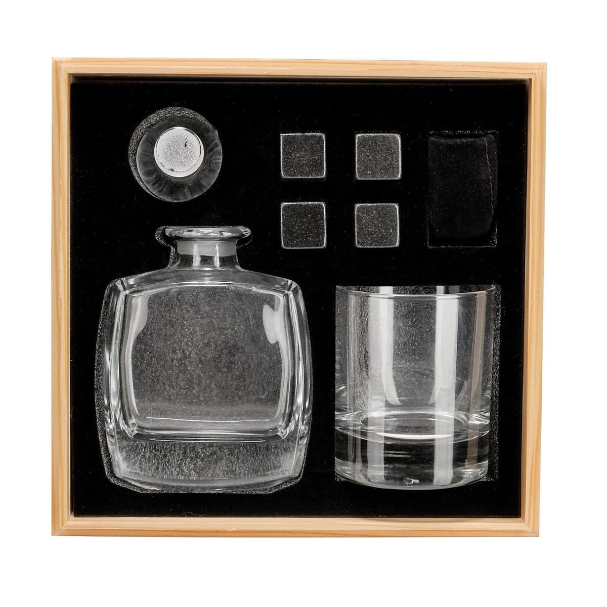 Set de bar. Incluye licorera, vaso de cristal, 4 enfriadores de piedra, bolsa de terciopelo con cierre de jareta y estuche de madera.