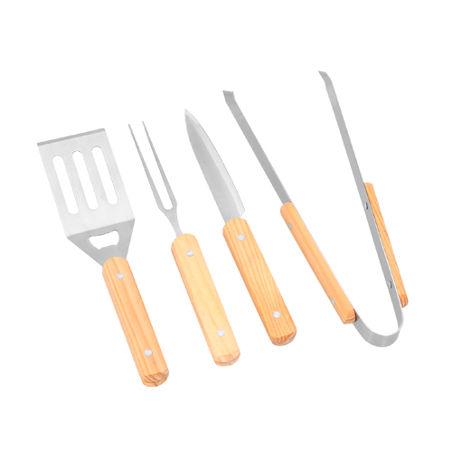 Set de BBQ en estuche de poliéster y sujetadores de madera. Incluye 4 utensilios: pinzas, tenedor, cuchillo y volteador.