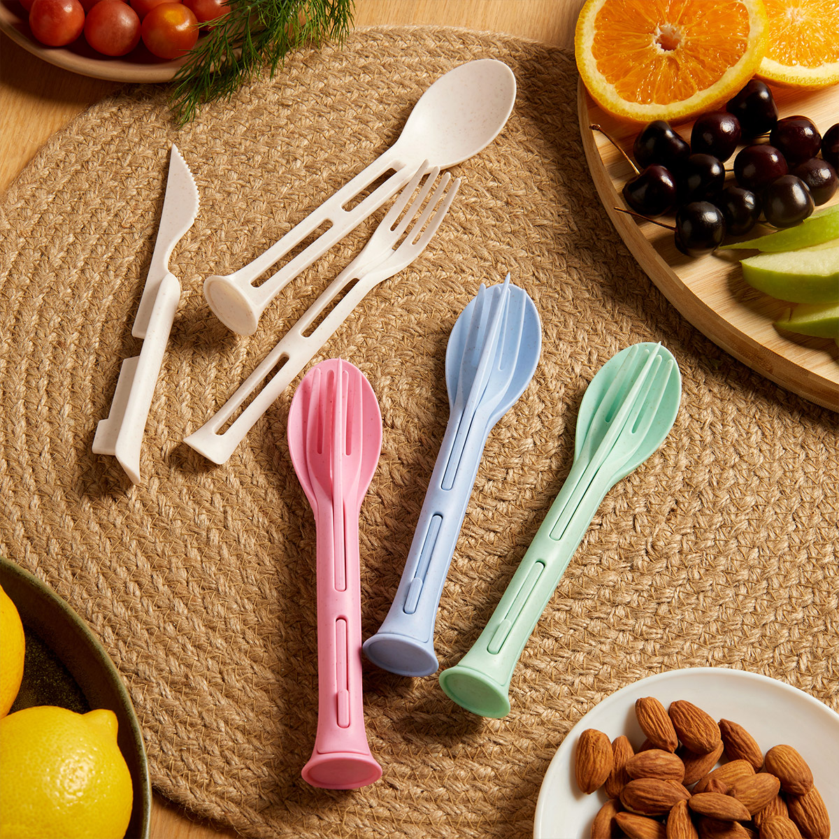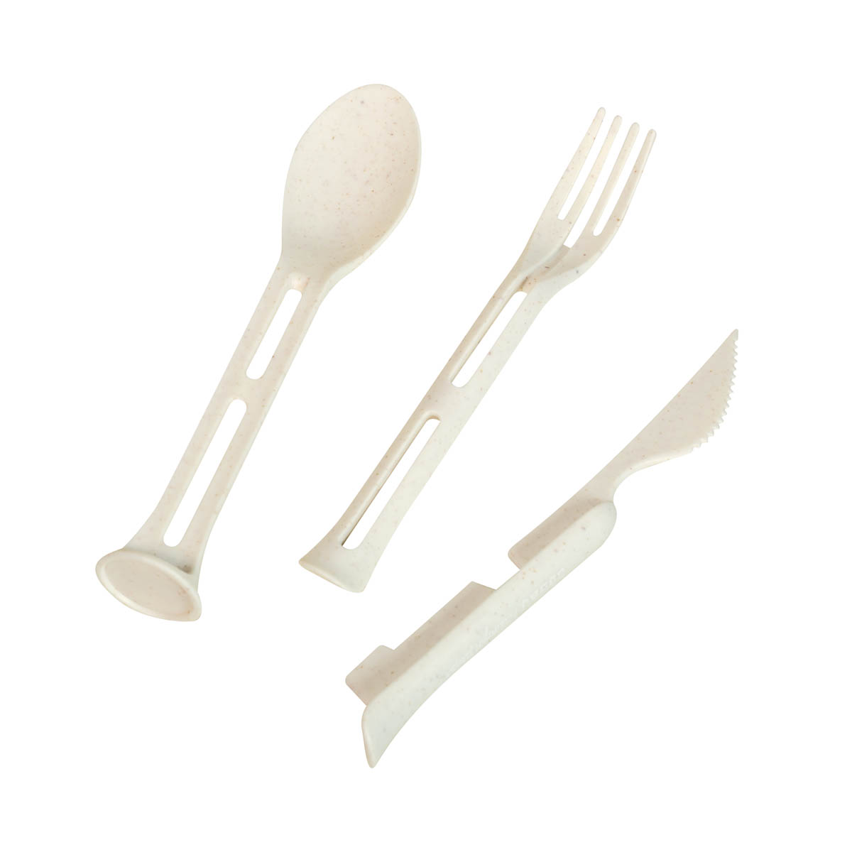 Set de cubiertos 3 en 1 desmontables. Cuenta con cuchillo, tenedor y cuchara. Tiene un peso ligero y es fácil de transportar. Incluye caja individual.