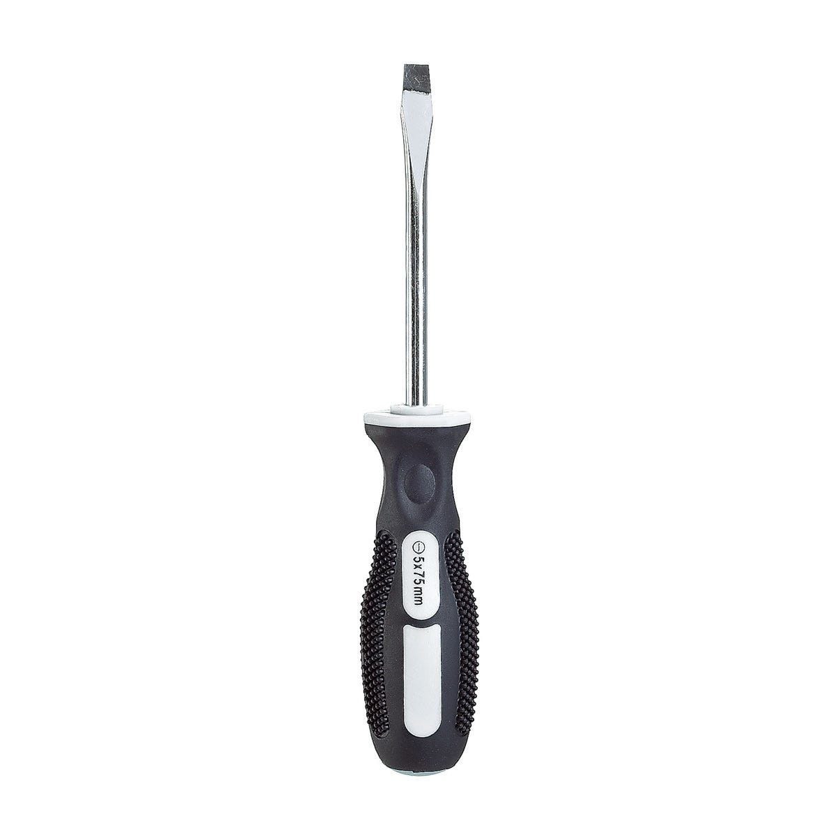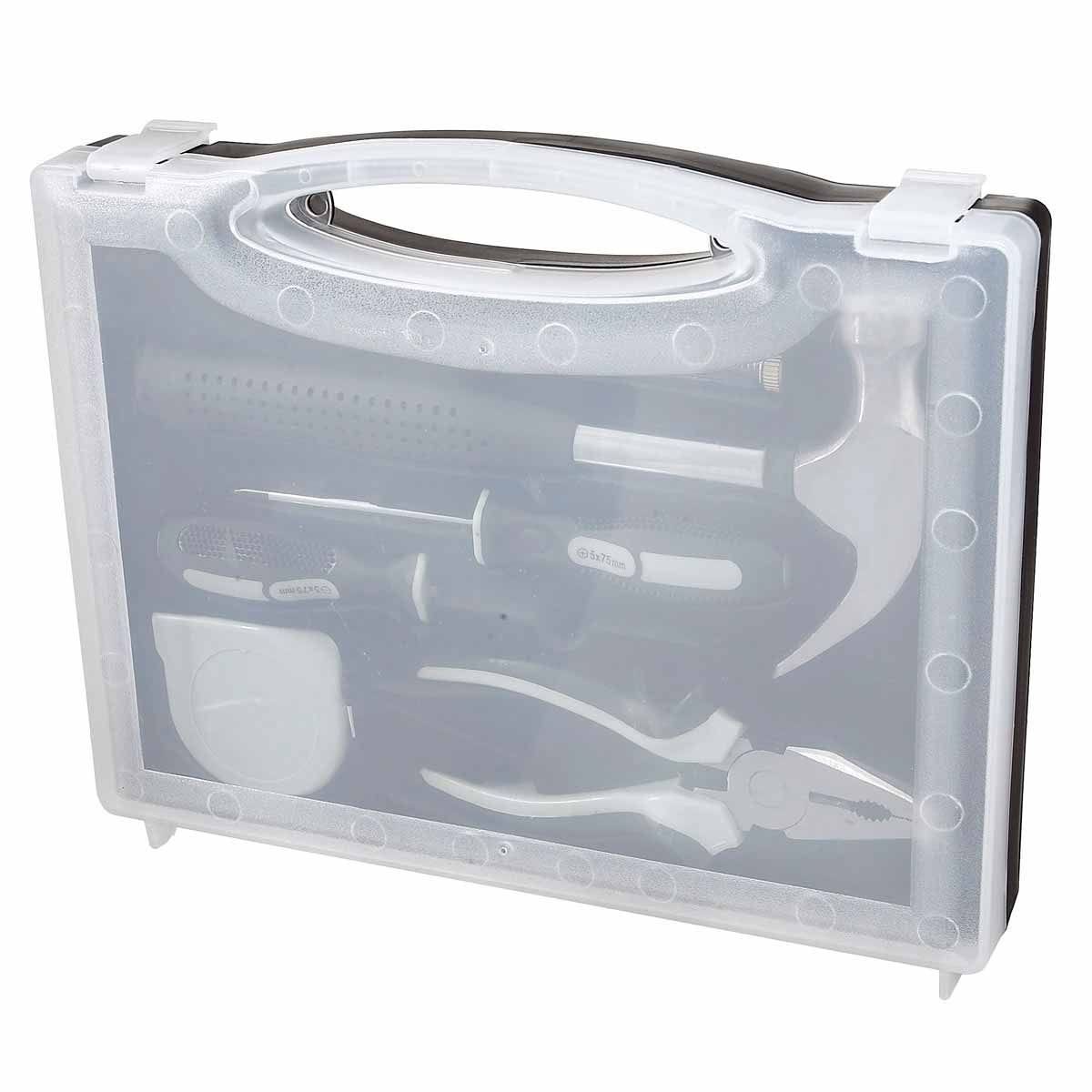 Contiene flexómetro de 2 m, desarmador plano y de cruz, martillo, verificador de corriente y pinzas. Incluye estuche.