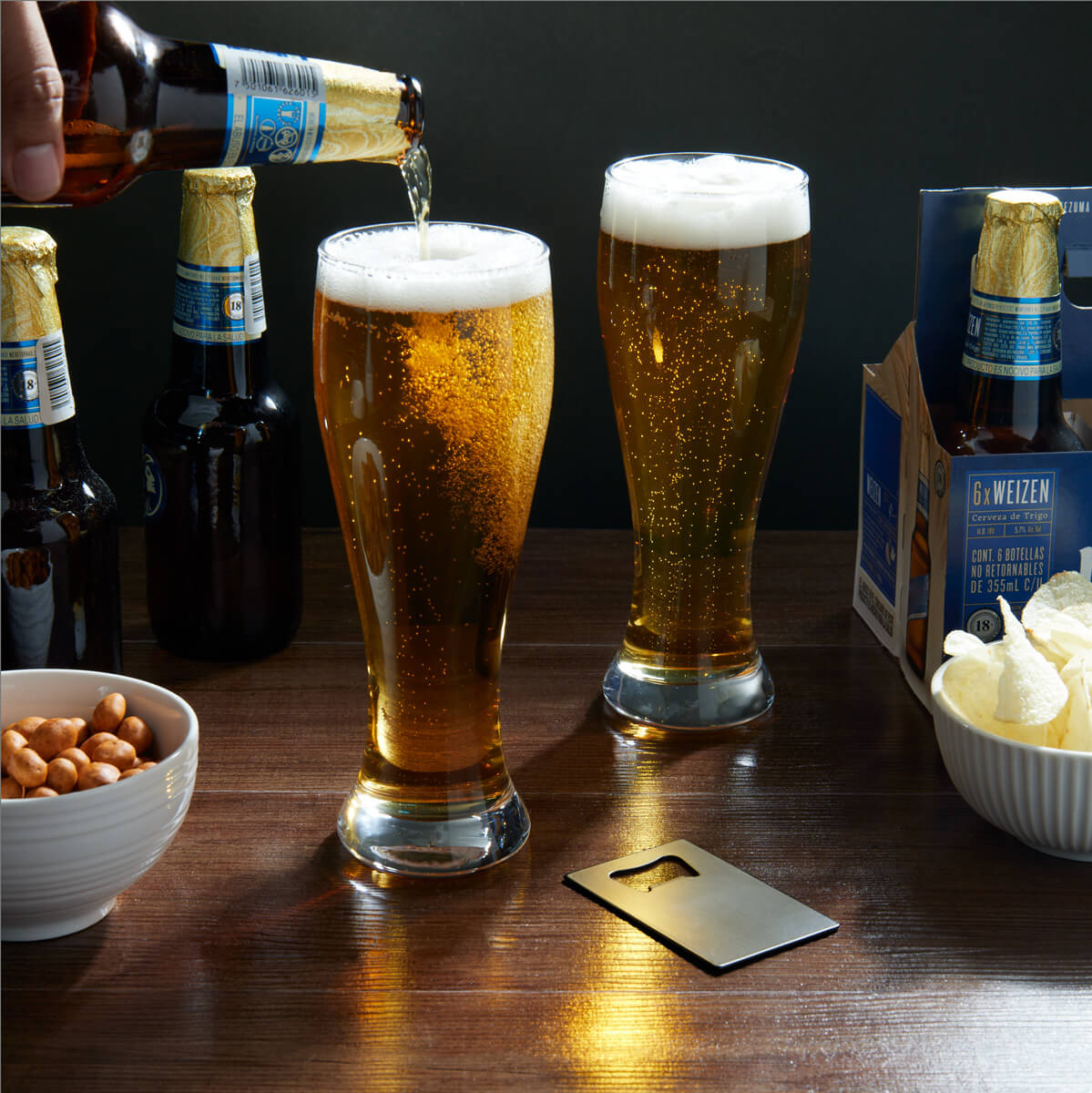 Set de 2 vasos de cerveza y destapador metálico. Disfruta de cada sorbo en tus reuniones o eventos sociales. Incluye caja ecológica tipo regalo.