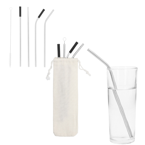 Set de popotes de acero inoxidable reutilizables con estuche de poliéster y correa ajustable que incluye: boquillas de silicón, 2 popotes curvos y 2 popotes rectos con cepillo limpiador.