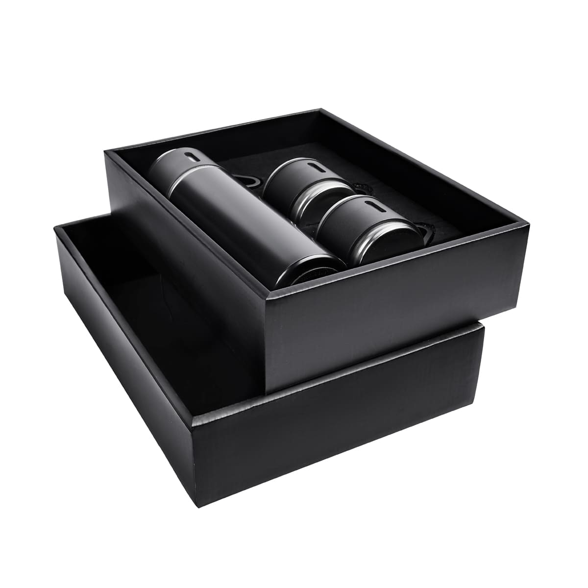 Set de regalo con 1 termo cuya tapa sirve como taza y 2 tazas adicionales. Termo doble pared cerrado al vacío, pared interna y externa de acero inoxidable, tapa interna de rosca con sistema push para verter fácilmente sin retirar el tapón, mantiene temperatura caliente 6 hrs y temperatura frí­a 8 hrs. Las tazas de acero inoxidable con un recubrimiento y asa de plástico. Incluye Caja de regalo.