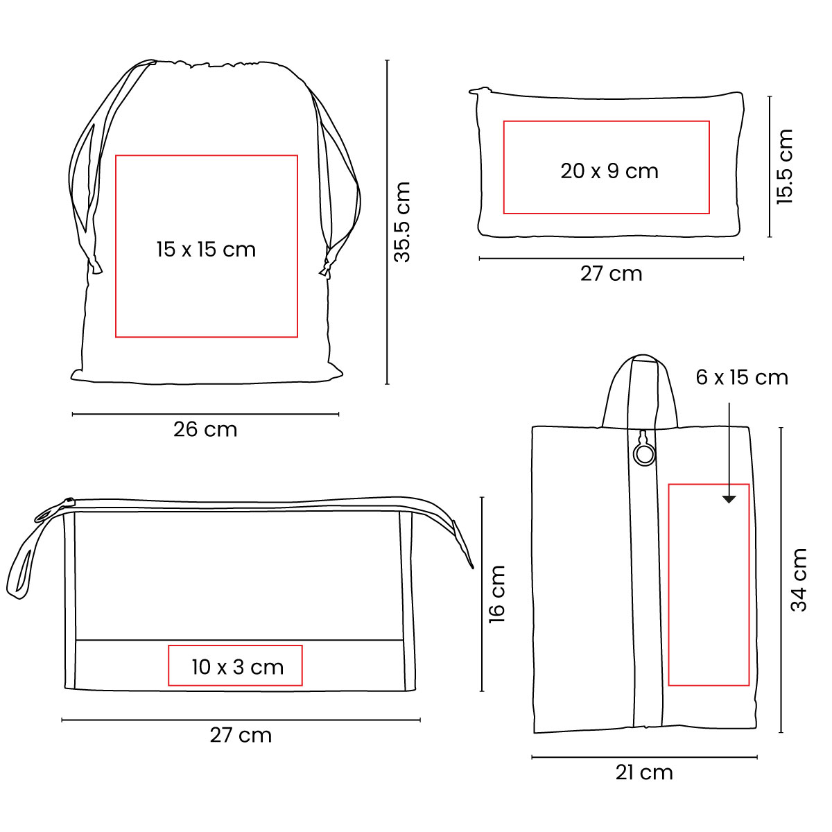 | Medida | 41x31x11 cm Bolsa grande / 33x28x11 cm Bolsa mediana / 33x 23×11 cm Bolsa chica / 30x22x11 cm Bolsa para ropa interior / 21x34x11 cm Bolsa para calzado / 26×35.5 cm Bolsa-morral / 27×15.5 cm Bolsa con cierre / 27x16x11 cm Bolsa cosmetiquera |