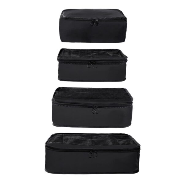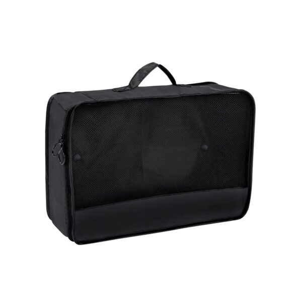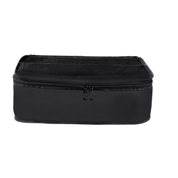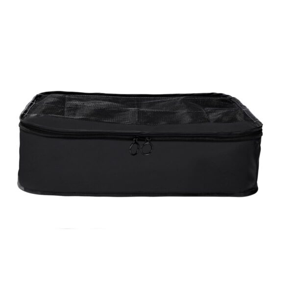 Organizador de maleta 8 en 1. Incluye 3 bolsas para ropa con malla para una mejor ventilación, la bolsa grande y mediana incluyen dos sujetadores interiores con broche de plástico para organizar tus artículos, además de broches de plástico que te permiten unir las diferentes piezas, 1 bolsa con cierre y asa para ropa interior, 1 bolsa con cierre para calzado, 1 bolsa con cierre tipo jareta, 1 bolsa chica con cierre y 1 bolsa cosmetiquera con malla.