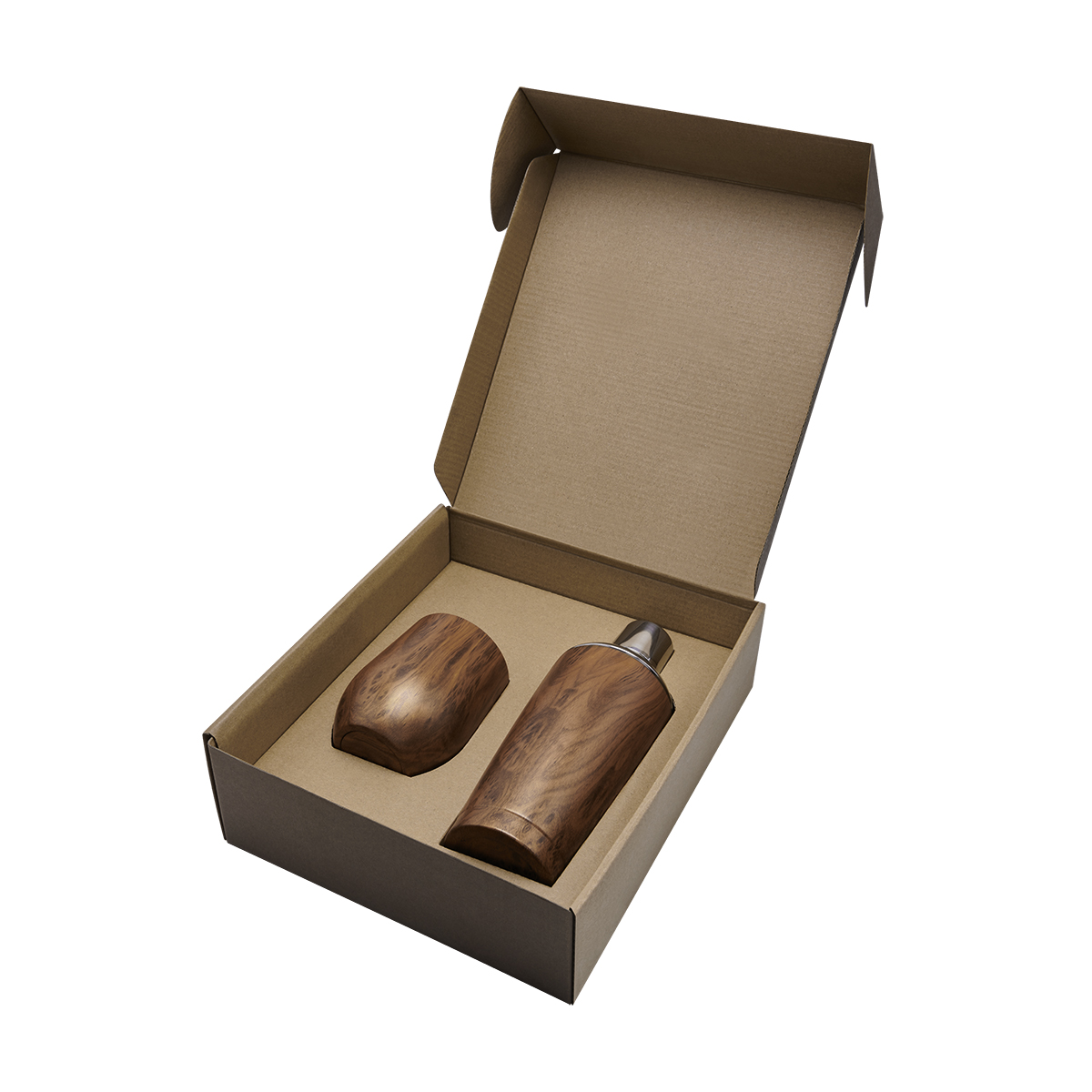 Set para preparación de bebidas. Incluye shaker y vaso metálico de doble pared, ambos sellados al vacío y caja.
