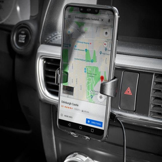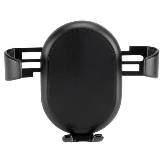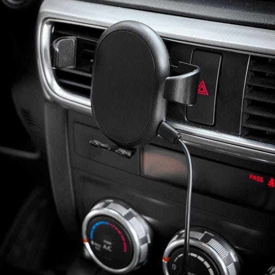 Soporte de smartphone para auto con función de carga inalámbrica. Incluye mecanismo ajustable de 7 a 10 cm de ancho. Se monta en las ventilas del aire acondicionado. Incluye cable cargador usb-micro usb.