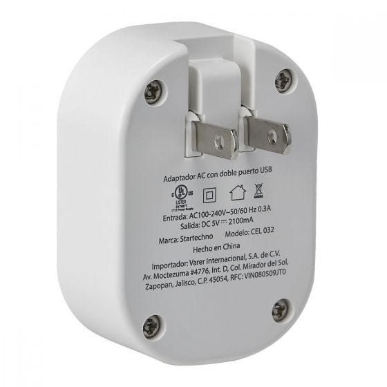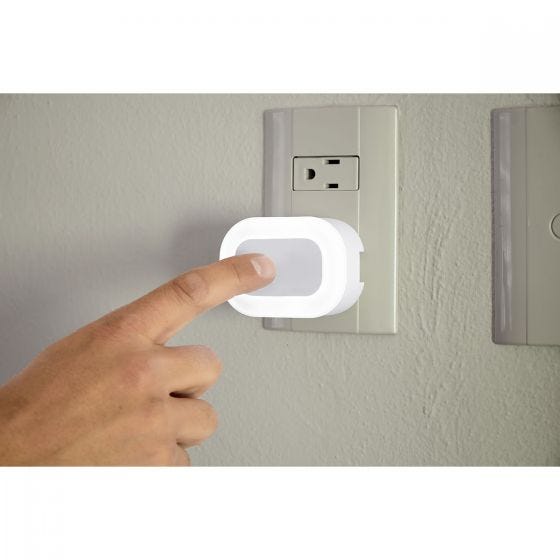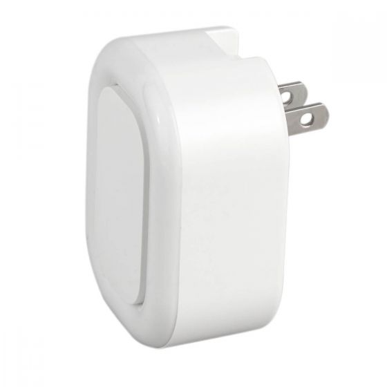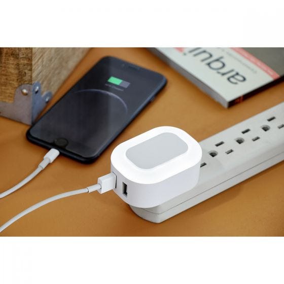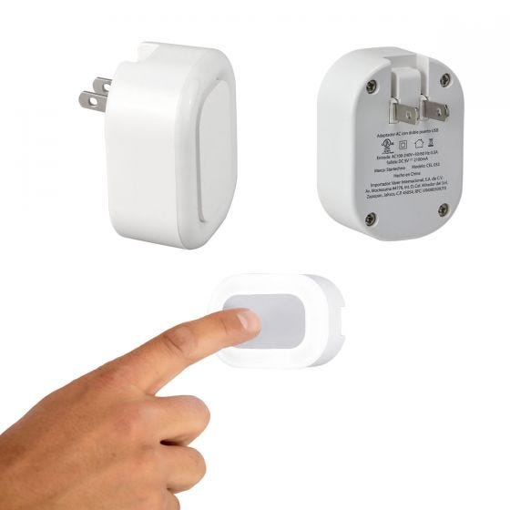 Adaptador de corriente con doble entrada USB para smartphone y tablet. Función luz de noche con encendido touch y 3 niveles de intensidad.