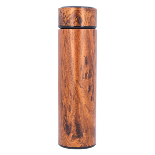 Termo con doble pared de acero inoxidable insulado al vacío. Incluye tapa enroscable y filtro infusor. Acabado tipo madera.