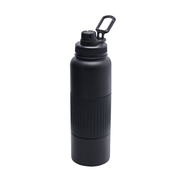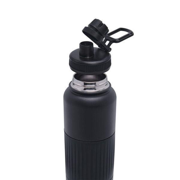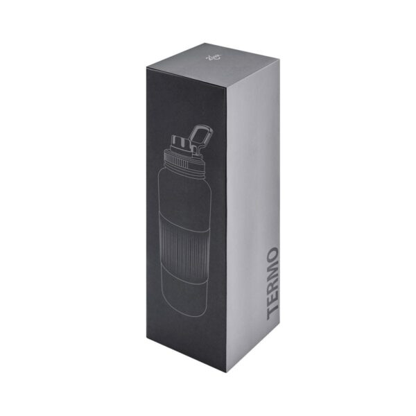 Doble pared. Cerrado al vacío. Pared interna y externa acero inoxidable. Cuenta con manga de silicón. Terminado tipo rugoso. Tapa de plástico con doble boquilla y asa. Mantiene temperatura caliente 6 hrs y temperatura fría 8 hrs aproximadamente. Incluye caja individual.