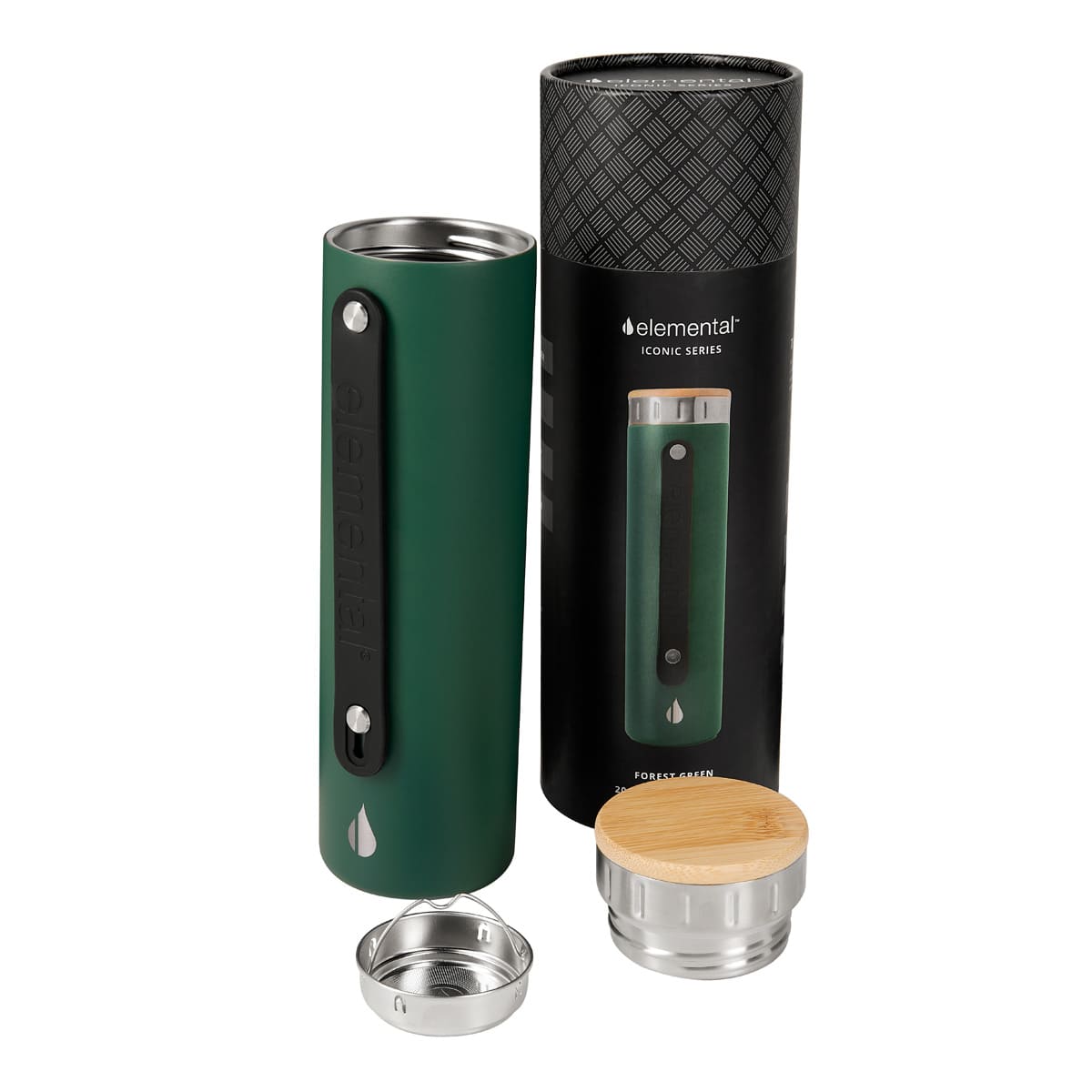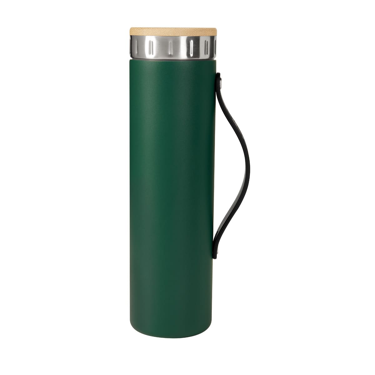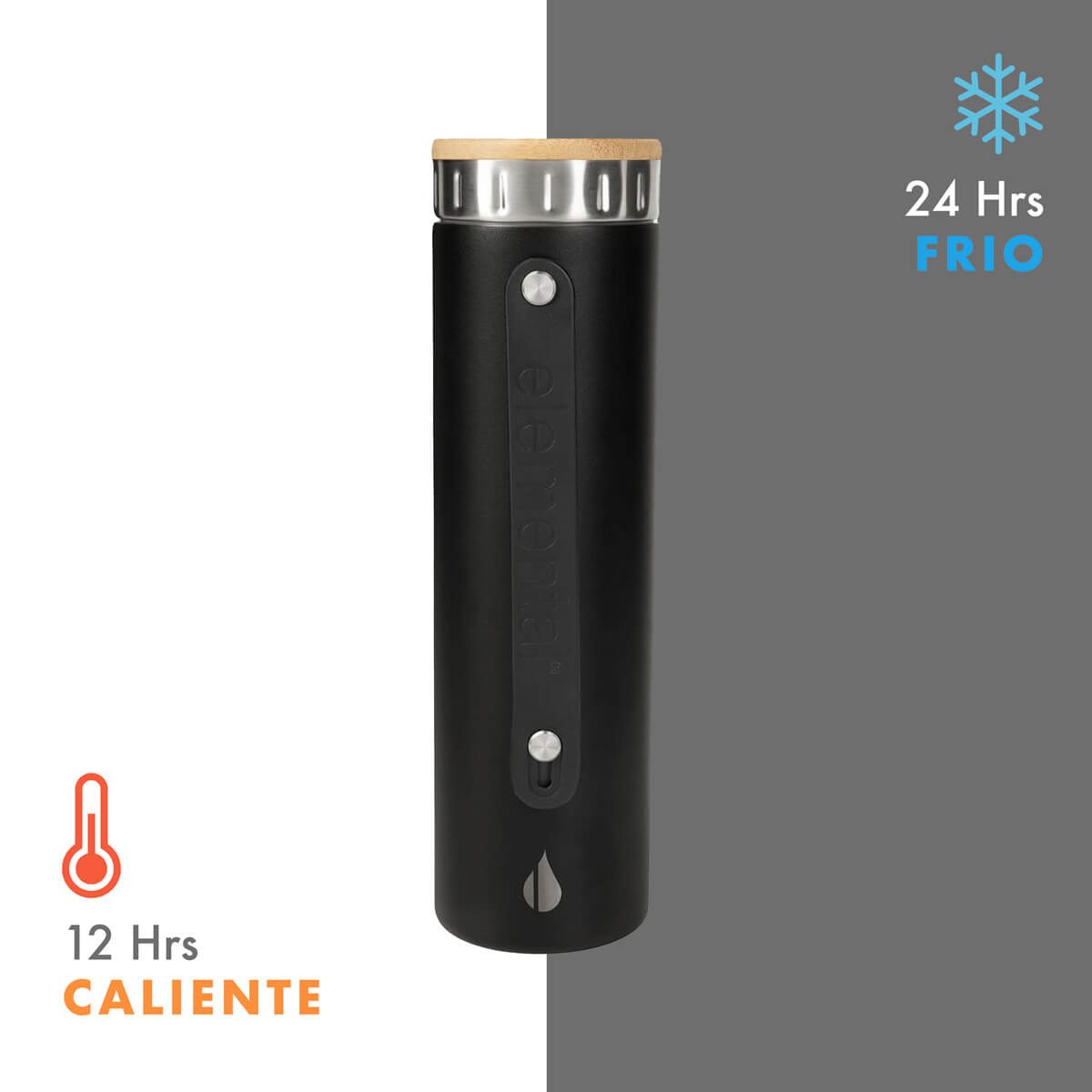 Tecnología TrueBarrier™ que usa aislamiento de triple pared. Doble pared de acero inoxidable y una capa de revestimiento de cobre. Cerrado al vacío. Material BPA free. Tapa de bambú. Contiene filtro de acero inoxidable. Banda de silicón ajustable y removible. Terminado rugoso. Base antiderrapante. Mantiene temperatura caliente 12 hrs y fría 24 hrs aproximadamente. Incluye caja individual. El bambú es un producto natural el cual puede presentar variaciones en tonalidades y vetas.