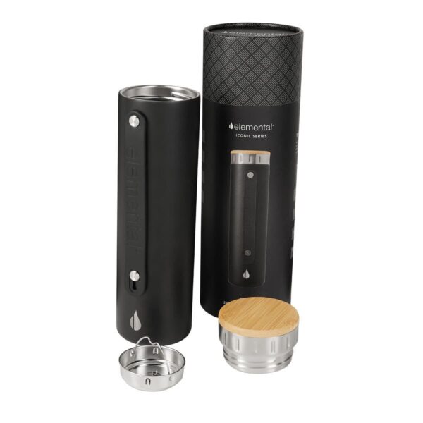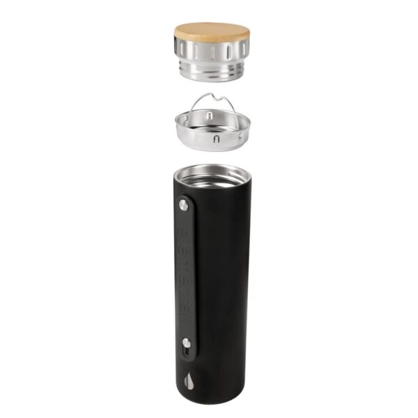 Tecnología TrueBarrier™ que usa aislamiento de triple pared. Doble pared de acero inoxidable y una capa de revestimiento de cobre. Cerrado al vacío. Material BPA free. Tapa de bambú. Contiene filtro de acero inoxidable. Banda de silicón ajustable y removible. Terminado rugoso. Base antiderrapante. Mantiene temperatura caliente 12 hrs y fría 24 hrs aproximadamente. Incluye caja individual.