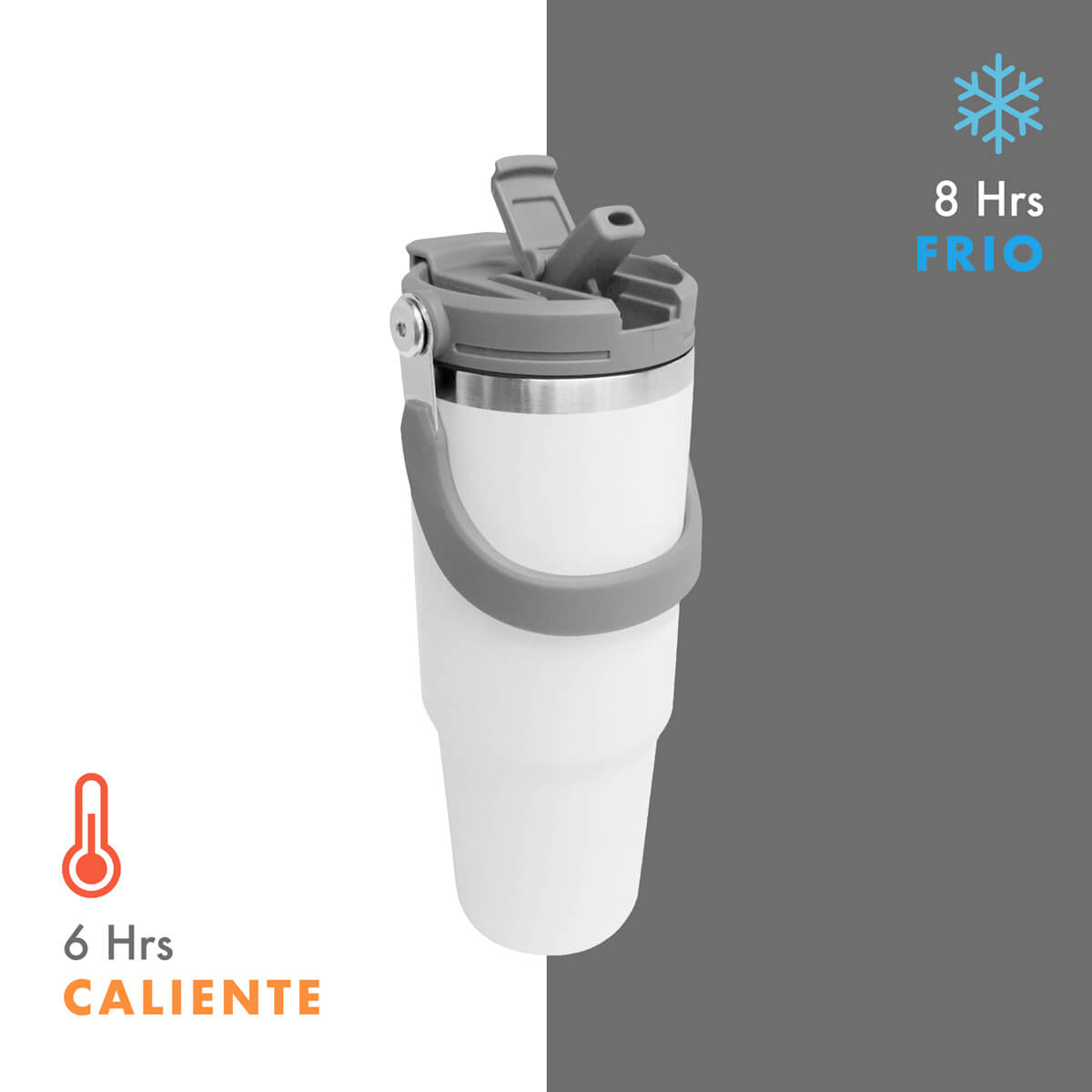 Doble pared. Cerrado al vacío. Pared interna y externa de acero inoxidable. Tapa con asa plegable de plástico con cierre de rosca. Sobretapa de push y popote retráctil. Mantiene temperatura caliente 6 hrs y temperatura fría 8 hrs aproximadamente. Incluye caja individual.