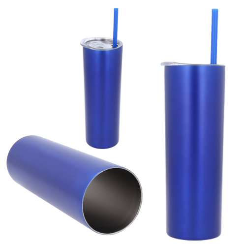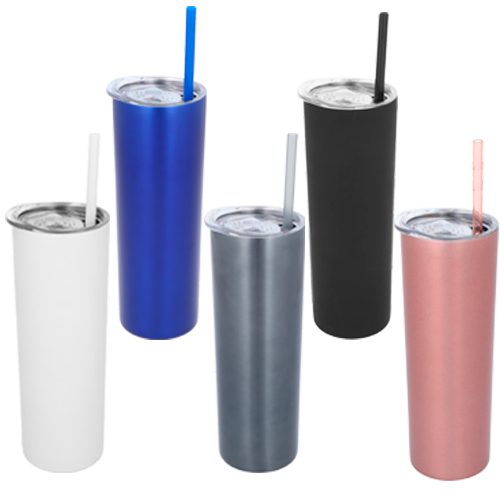 Termo con doble pared de acero inoxidable insulado al vacío. Incluye tapa de plástico a presión con boquilla deslizable y popote de plástico.