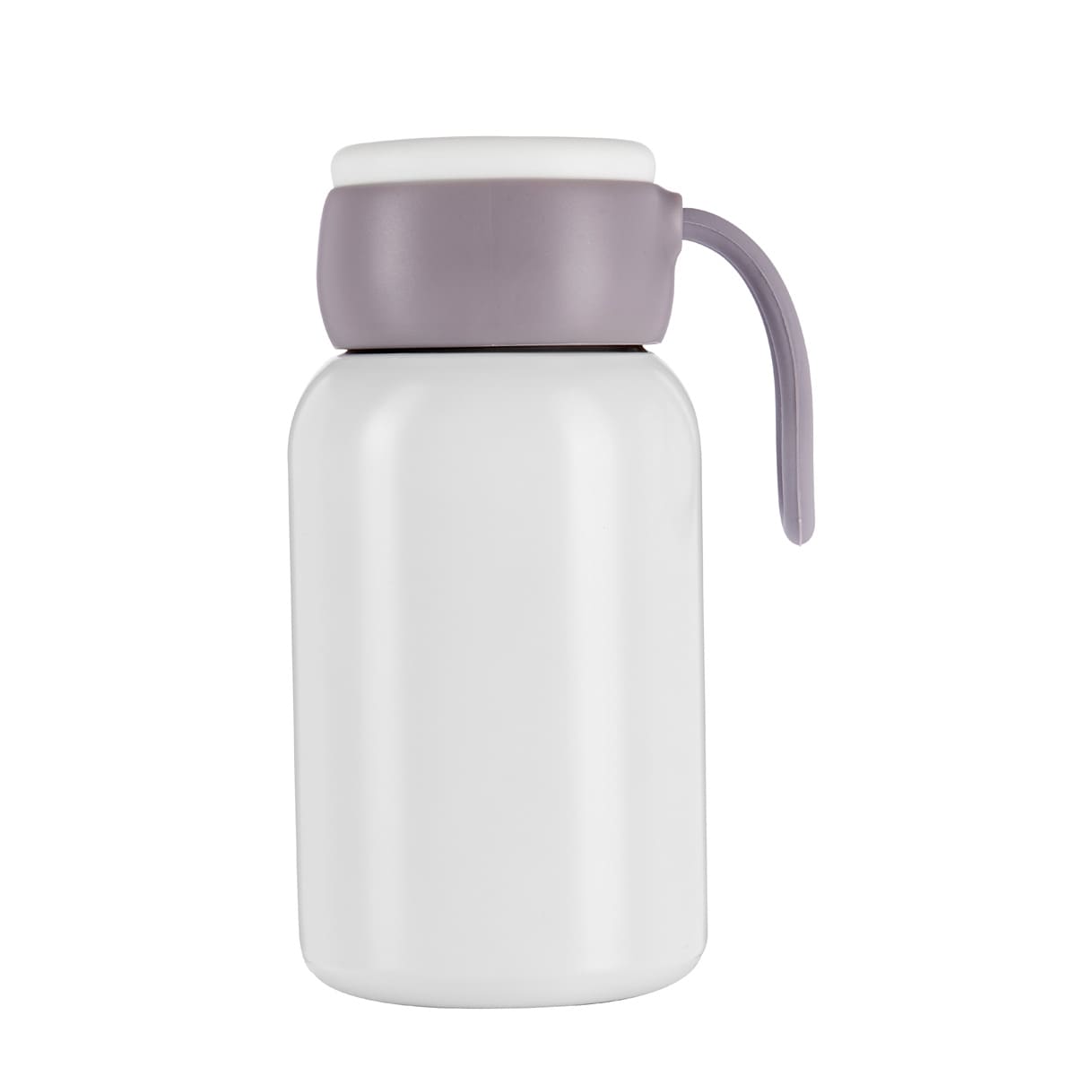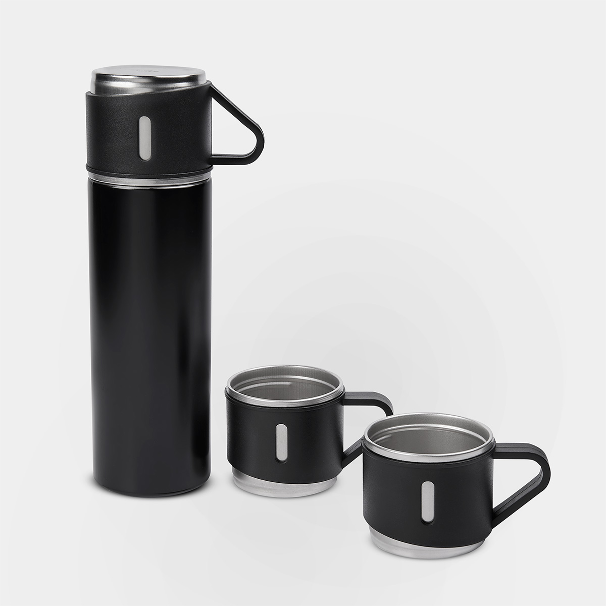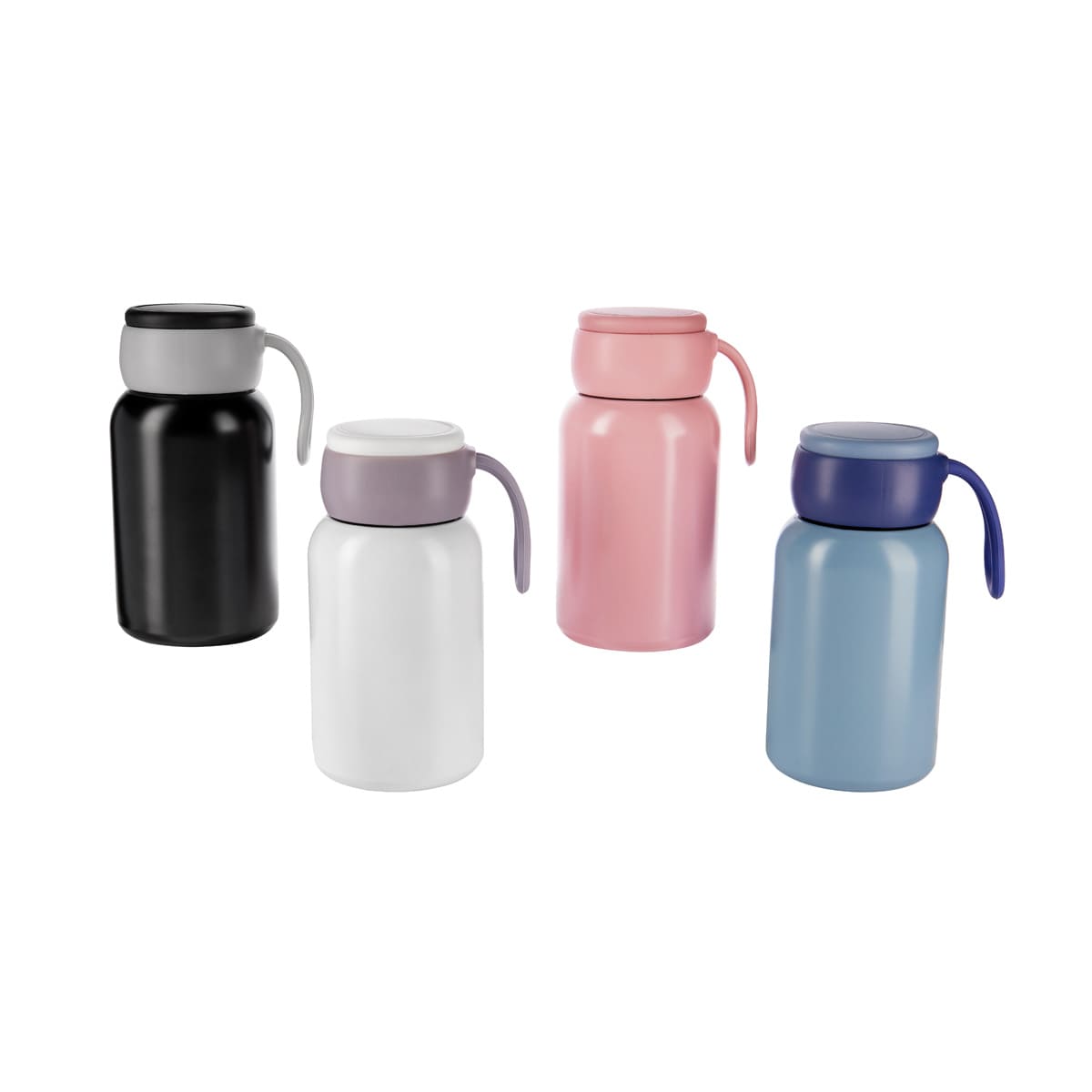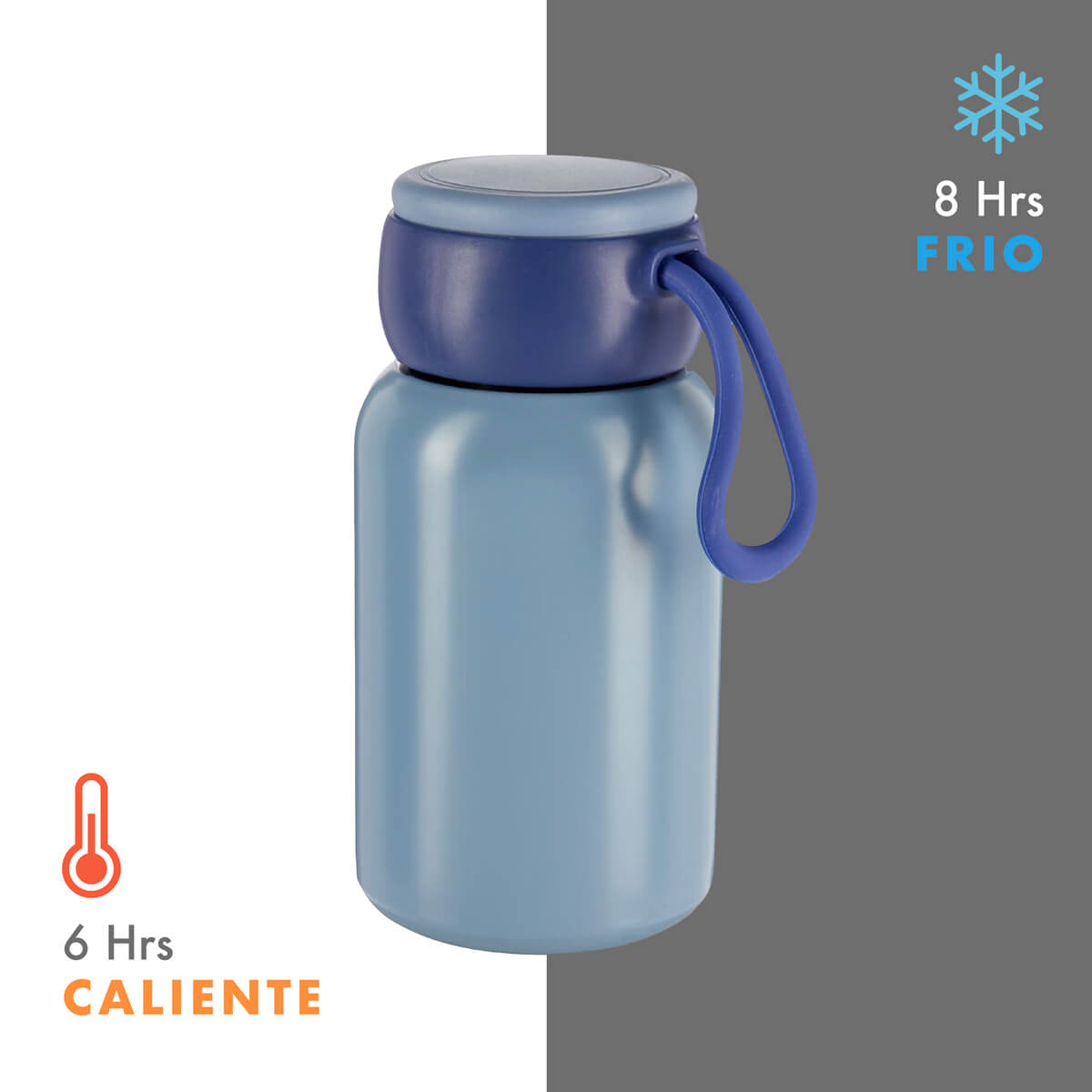 Doble pared. Cerrado al vacío. Pared interna y externa de acero inoxidable. Tapa de plástico bitono con sistema de rosca y asa de silicón. Mantiene temperatura caliente 6 hrs y temperatura fría 8 hrs aproximadamente. Incluye caja individual.