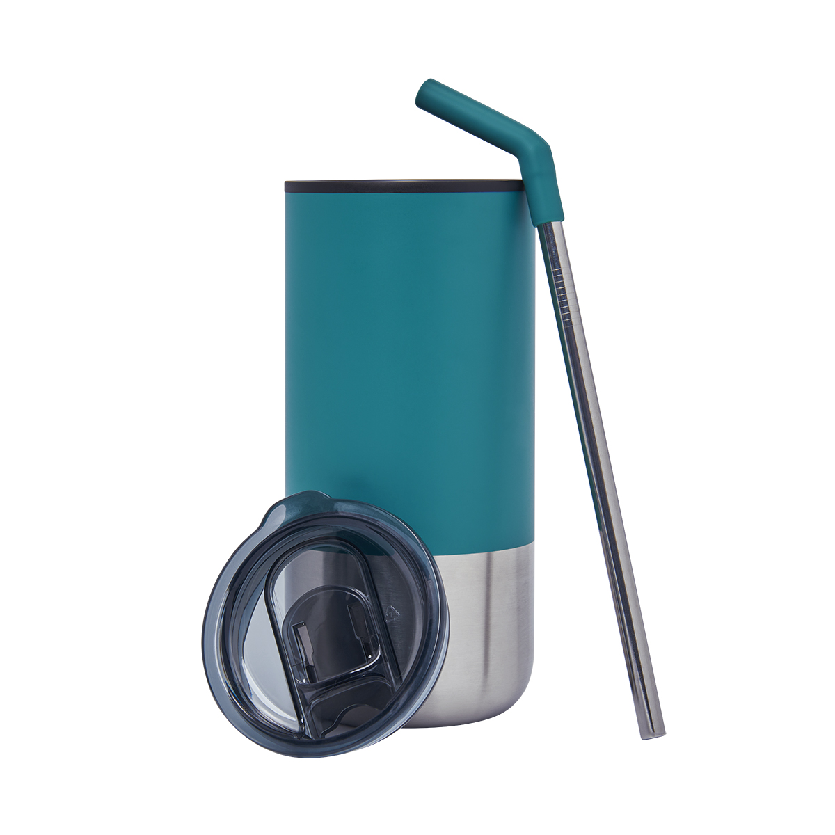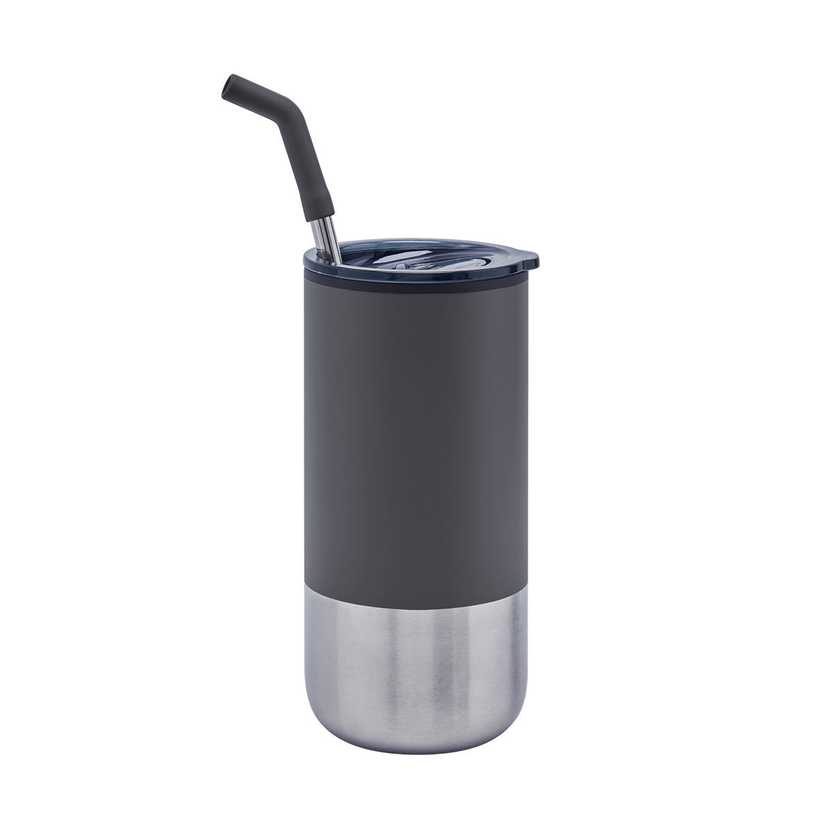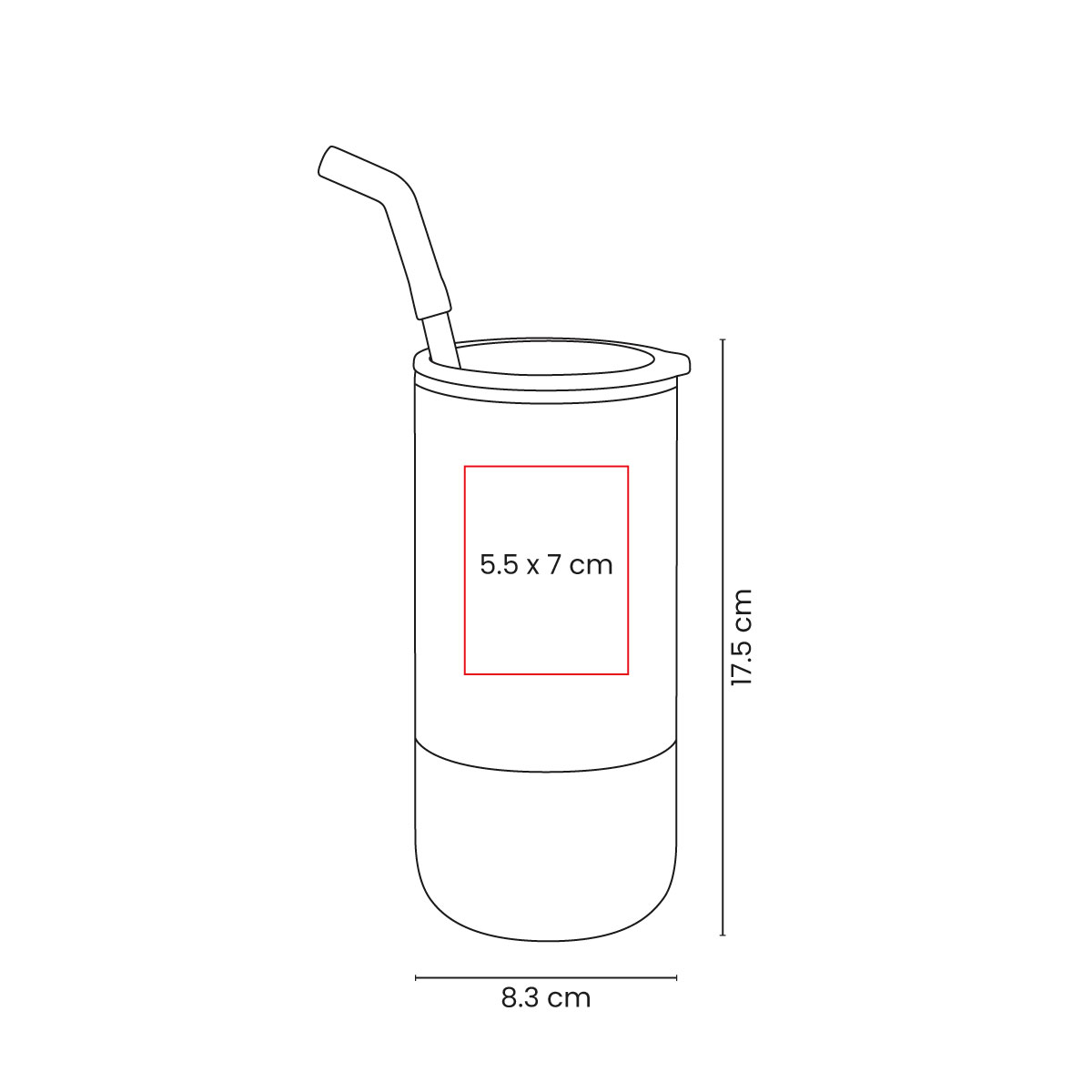 Doble pared. Pared interna plástico, pared externa acero inoxidable. Tapa de plástico con válvula de seguridad y popote metálico con boquilla removible de silicón. Incluye caja individual.