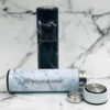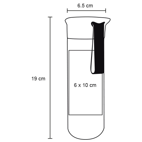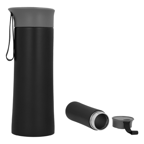 Termo con doble pared de acero inoxidable, tapa de plástico enroscable y correa de silicón.