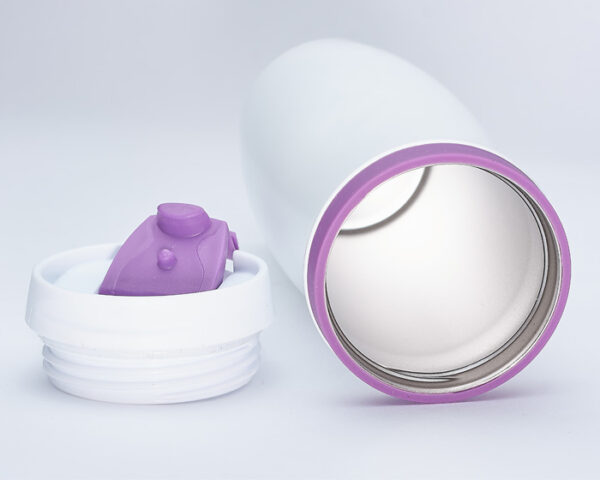 Termo metálico con diseño ergonómico, con acabado en esmalte blanco y banda superior de silicón en color. Cuenta con interior en acero inoxidable, tapa de rosca hermética, seguro para líquidos con bisagra en color y goma antiderrapante en la base. CAP. 400 ml. Presentación: caja en color blanco.