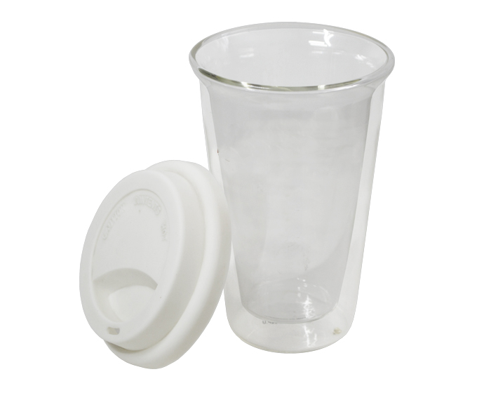 Vaso de vidrio de doble capa, con tapa de silicón flexible. CAP: 10 OZ.
