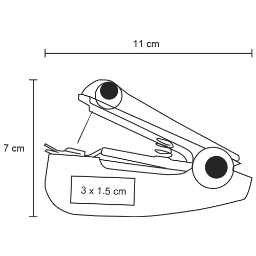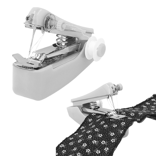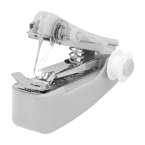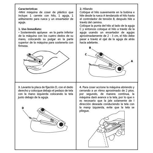Mini máquina de coser de plástico que incluye: 1 carrete con hilo, 1 aguja, 1 aditamento para rueca y un ensartador de aguja.