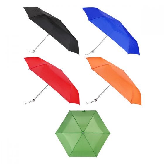 Manual. 6 Paneles, paraguas de bolsillo con mango de plástico. Incluye funda.